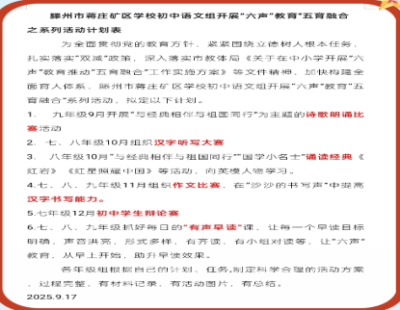 (一)蒋庄矿区学校初中语文组全体语文教师于9月16日去滕南中学,参加2025年滕州市初中语文学科研讨会。